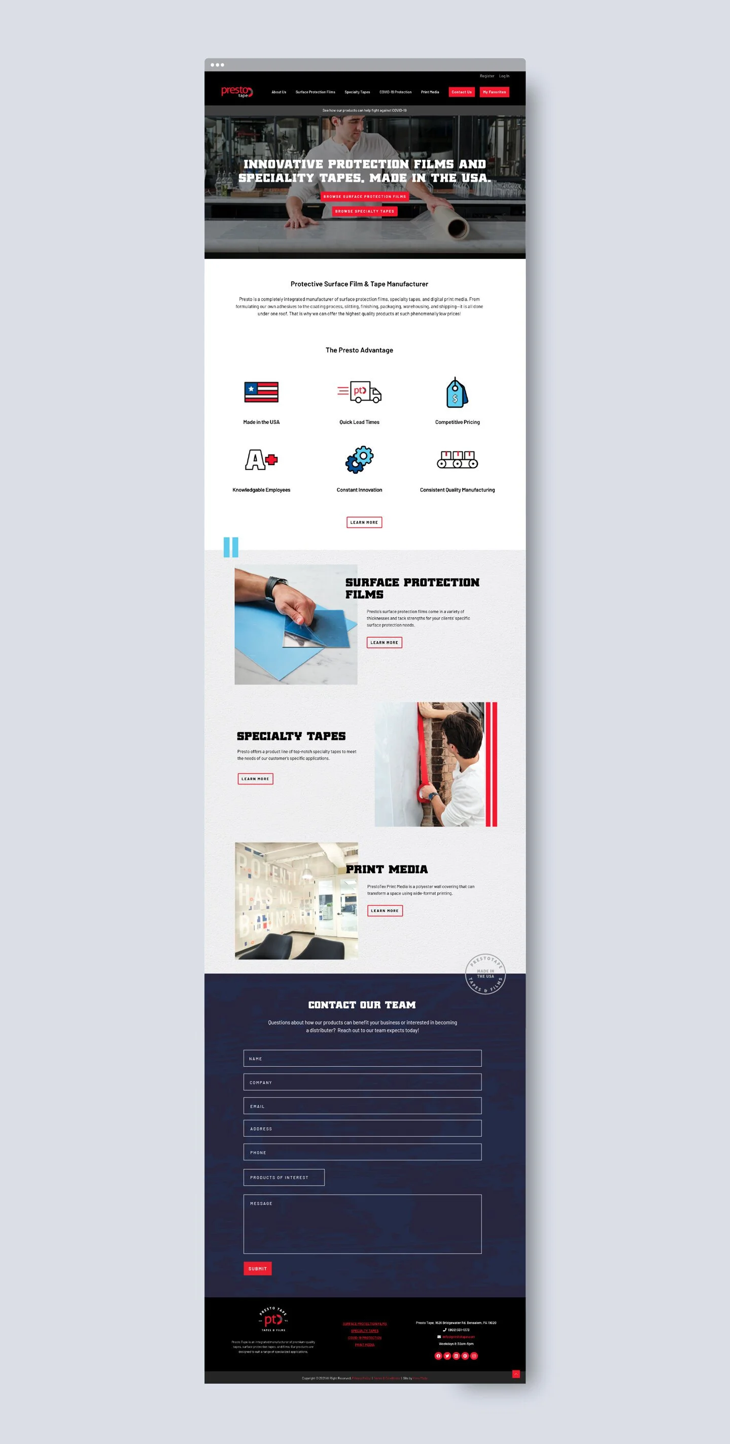 Presto Tape is a completely integrated manufacturer of surface protection films, specialty tapes, and digital print media. From formulating their own adhesives to the coating process, finishing, packaging, warehousing, and shipping—it is all done under one roof. Established in 1991, Presto has been proud to offer high quality products made right here in the USA.